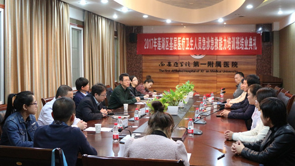 10月26日下午,我校第一附属医院举行了“2017年莲湖区基层医疗卫生人员急诊急救能力培训班”结业典礼,一附院院长李亚军、副院长吴戈、院前急救科主任刘延峰和莲湖区卫计局副局长王景民、社区卫生服务指导中心主任赵慧乐,以及培训学员、工作人员等28人参会。会议由黎耀东科长主持。 首先,刘延峰主任汇报培训的基本情况。他指出本次培训以提升莲湖区急诊急救能力为目的,带教老师均为高年资、临床经验丰富的医师,讲授内容全面...