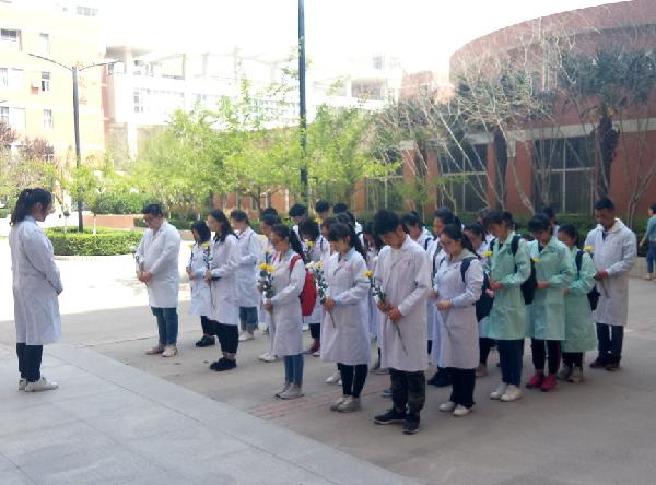 4月3日中午,我校学生社团联合会青年马克思主义学社35名学生代表在弘德馆举行了“缅怀无语体师 恪守仁爱之心”为主题的清明节纪念活动。马克思主义学院院长桑利娥、副院长刘军林、教学科科长王进、党政办主任李亚芳及医学伦理学教研室教师共同参与了此次活动。 中午十二点半,本次纪念活动正式开始,按照活动主持人安排,参加活动的全体师生肃立默哀一分钟,为无语体师献花,随后由学生代表发言,感恩遗体捐献者的无私奉献精神...