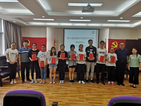 6月21日中午,“第十届全国大学生数学竞赛”颁奖典礼在卫生管理学院院会议室举行,典礼由数学教研室主任杨君慧老师主持。 首先杨君慧老师宣读了我校11位获奖同学的名单,他们分别是来自临床医学院的叶贤淑和张小宝同学获得一等奖,来自药学院的王福栋、赵桃娃和食品工程学院的刘阳同学获得二等奖,来自中药的王引弟、药品市场营销的高恬恬等6位同学获得三等奖。 其次卫生管理学院副院长苗建宁和党总支副书记刘建刚分别为11名获...