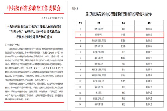 近日,由省委教育工委、省教育厅主办,陕西科技大学承办的第三届陕西高校学生心理健康教育课程教学省级现场展示活动在陕西科技大学举行。来自全省各高校心理健康教育队伍的21名教师参加了决赛。我校学工部大学生心理健康教育发展中心教师李宇晨获“教学标兵”奖,为历届比赛我校选手取得的最佳成绩。表彰文件本次教学比赛是省委教育工委举办的第九届“阳光护航”心理育人宣传季重要活动内容之一。按照大赛总体活动安排,学校于4...