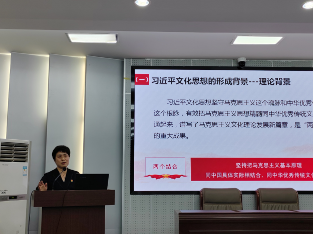 为持续深入学习贯彻习近平新时代中国特色社会主义思想,推进党纪学习教育走深走实,6月27日,副校长和新盈以“深刻理解习近平文化思想的形成与科学内涵”为题为机关二党总支全体党员讲授专题党课。机关二党总支书记朱文斌主持。和新盈讲党课和新盈以“文化与文明的内涵”为切入点,从习近平文化思想的形成、习近平文化思想的科学内涵以及坚定文化自信肩负新的文化使命等三个方面深刻阐述了习近平文化思想的重要意义。她指出,习...