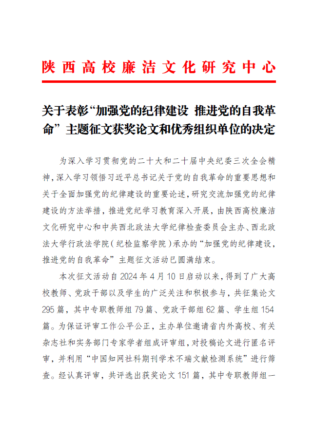 近日,陕西高校廉洁文化研究中心公布了《关于表彰“加强党的纪律建设 推进党的自我革命”主题征文获奖论文的决定》,我校共有2项作品获奖。校纪委冯一鸣的《延安时期中国共产党干部廉政教育的当代启示》和叶晋良、郭卫党、鲜娅静的《关于省属高校开展政治巡察工作的实践与思考——以leyu·乐鱼(中国)体育官方网站为例》分获党政干部组二等奖。据悉,本次征文活动由陕西省高校廉政文化研究中心和西北政法大学纪律检查委员会主办,旨在推动全省各高....
