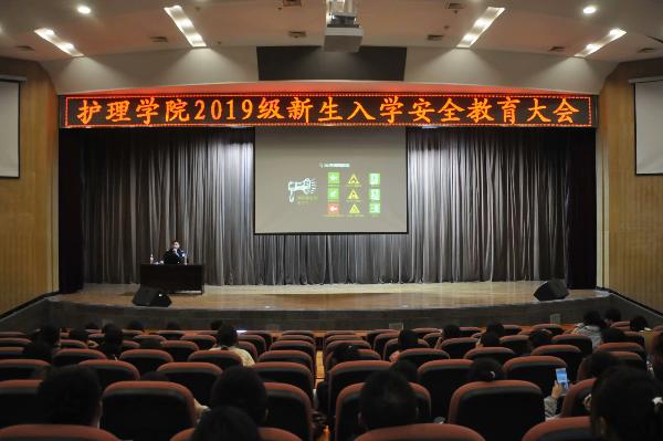 为进一步提高新生安全防范意识,提升学生应对各类突发事件的能力,帮助新生开启健康积极的大学生活,护理学院于近日在学院报告厅及学校学术报告厅分三场次举行2019级新生安全教育大会。保卫处处长金英、护理学院新生辅导员及全体新生参加会议,大会由学校保卫处工作人员、护理学院兼职辅导员常大林老师主讲,学生科科长张红梅主持。 会议现场 金英处长在会上强调校园安全工作是学校的重点工作,要高度重视,强化责任意识,要求...