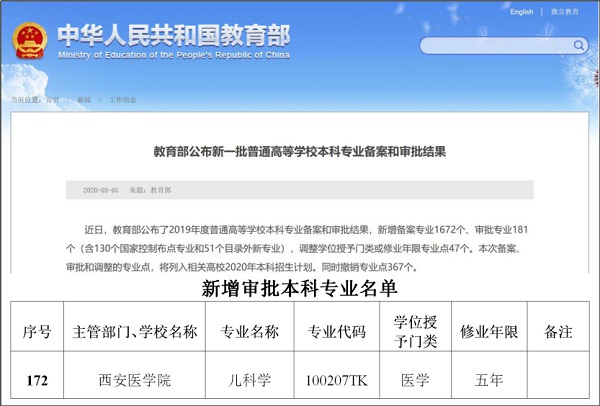2020年3月3日,教育部公布2019年度普通高等学校本科专业备案和审批结果【教高函〔2020〕2号】,本年度各高校新增备案专业1672个、审批专业181个,我校儿科学(100207TK,医学学位,五年制)专业获批,陕西终于有了自己的儿科学本科专业。 儿科医生紧缺是一个全国性的问题。随着2015年二孩政策的落地,全国每年多出生几百万人口,儿科医生的工作越来越繁重,“儿科医生荒”的问题更加凸显。据有关统计数据,我国每千名儿童拥有的儿...
