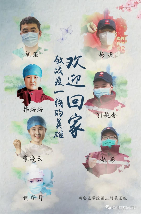 亲爱的同事们: 你们辛苦啦!全院干部职工一直牵挂着你们,得知第三批援鄂人员杨庆、孙婉香、赵澎载誉归来,抵达西安,全院职工难掩激动喜悦之情,欢迎你们凯旋而归! 白衣执甲,逆行出征。自新冠肺炎疫情发生以来, 我院坚决贯彻落实习近平总书记重要批示指示精神和党中央决策部署,迅速响应上级号召,共派出2批7名医务工作者驰援武汉,用生命和汗水守护着武汉这座城,传递了陕西人民与湖北人民守望相助、患难与共的深厚情谊,...
