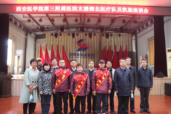 今天是我校第三附属医院第二批援鄂医疗队员杨庆、孙婉香、赵澎凯旋的日子,他们圆满完成了党和国家交付的任务,胜利而归。 陈玲副院长和援鄂人员在临潼合影 4月2日12:00时,业务副院长陈玲带队驱车前往临潼迎接英雄们回家。 住院楼前,大家早早举着横幅和欢迎牌迎接英雄们的归来,下午15时,随着三位英雄们举着旗帜走进医院,大家爆发出热烈的掌声,欢迎仪式拉开了序幕。仪式由第三附属医院党委书记王民坤主持。 迎接英雄回...