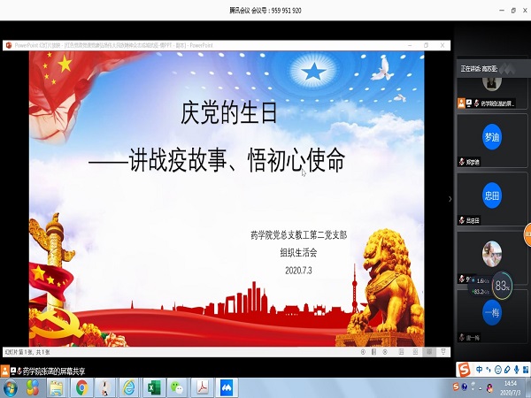 2020年7月3日下午,药学院党总支教工二支部通过腾讯会议形式举行了一场线上“迎党的生日、讲战疫故事、悟初心使命”组织生活会。会议由支部书记张寒主持。 首先,张寒书记组织大家学习“在常态化疫情防控中加强高校基层党建‘四个一’行动方案”文件精神,并邀请吕忠田、王黎、边军昌、高苏亚、张彦、何昊、扈本荃、罗国平、李伟泽、陈程、郑梦迪等同志代表发言。 药学院党总支教工二支部线上组织生活会 会上,吕忠田同志以“...