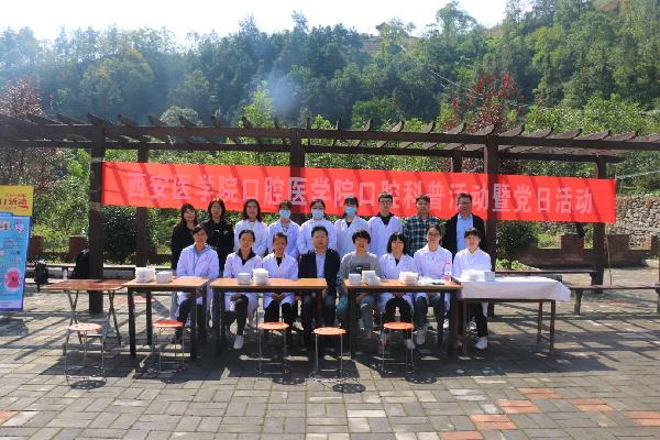 2020年是决战决胜脱贫攻坚和全面建成小康社会之年,为进一步助力脱贫攻坚,9月23日,口腔医学院一行师生共17名党员赴对口帮扶的丹凤县花瓶子镇油房坪村开展口腔健康扶贫暨党日活动。 口腔医学院师生参与口腔健康扶贫暨党日活动合影 学院结合专业特点在油房坪村开展了义诊、口腔流行病学调查及口腔健康宣传教育等系列活动。宣教组的师生在活动场地挂起宣传横幅、播放健康教育视频、摆放口腔科普知识展板、积极分发口腔保健知识...