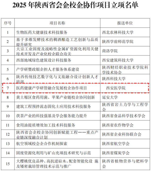 近日,省科学技术协会发布了《关于2025年陕西省会企校企协作项目立项的通知》(陕科协发〔2025〕事企字14号)。我校公共卫生学院院长门可教授作为项目负责人所申报的《医药健康产学研管融合发展校企协作项目》成功立项,获得资助经费10万元。此次立项标志着公共卫生学院与西咸新区泾河新城科技产业园企业发展协会前期签署框架战略合作协议并共建实体研究中心后,在产学研深度融合方向上迈出了坚实一步。陕西省会企校企协作项目....
