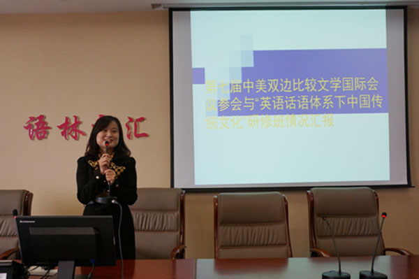 (英语系)2016年11月16日下午2:00,英语系外出参会、访学教师就访学、参会期间所见、所闻、所感在系学术报告厅进行了分享交流。交流报告会由英语系主任陈蓁主持。 此次分享汇报,由4位教师代表分别就其与团队在上海、北京、山西、重庆相关高校学习的所见所获进行了交流。首先,唐臻娜老师就其在复旦大学学习做了“英语话语体系下的中国传统思想与文化”的交流报告。唐老师以“中国故事”为题,通过PPT展示,视频“2016杭州G20...