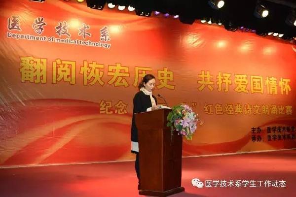 (医学技术系)为了纪念“一二·九”运动81周年,激发广大师生的爱系、爱校、爱国热情,提高党员的政治意识、大局意识、核心意识、看齐意识,营造朝气蓬勃、积极向上的校园文化氛围,医学技术系党总支于2016年12月9日下午14时在未央校区学术报告厅举办了“翻阅恢宏历史,共抒爱国情怀——纪念‘一二·九’红色经典诗文诵读比赛”。教工党支部和学生党支部共推选出9个优秀节目参加比赛。 耿潇潇副书记致辞 参赛师生满怀崇敬与自豪...