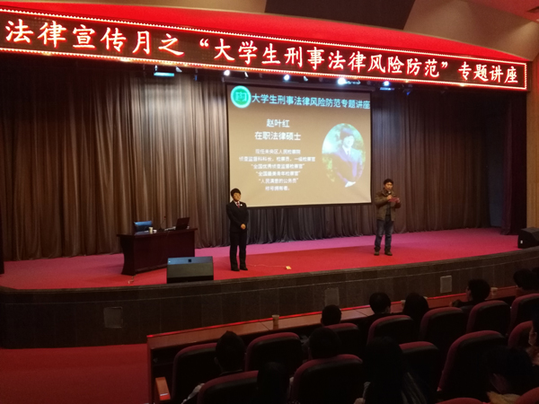 (卫生管理系)为贯彻省教育厅“《陕西省教育系统开展法治宣传教育的第七个五年规划(2016-2020年)》的通知”精神,由我校党委宣传部、校团委主办,卫生管理系承办的法治宣传月之“大学生刑事法律风险防范”专题讲座于12月12日下午2:00,在学术报告厅顺利进行。此次讲座面向全校师生,近500人参与。 讲座开始前,主持人鲁江老师对到来的各领导、老师进行了介绍,并强调了我校普法宣传月及此次法律知识讲座的意义,隆重介绍了此...