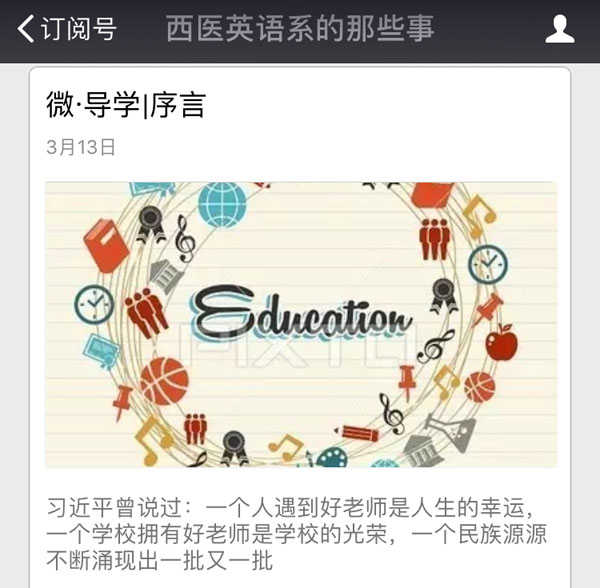 (英语系)为更好落实英语专业本科生导师制,提高英语专业本科生培养质量,促进英语专业学生学习,英语系决定借助微信公众号——“西医英语系的那些事”,开展“导学有法Follow Me”微信导学活动,由导学教师每周向学生推荐优秀读物、经典论文、励志电影、就业引导、毕业论文撰写等内容。 2016年3月13日,“导学有法Follow Me”微信导学活动正式上线。英语系副主任薛英利引用习近平主席的话:“一个人遇到好老师是人生的幸运,...