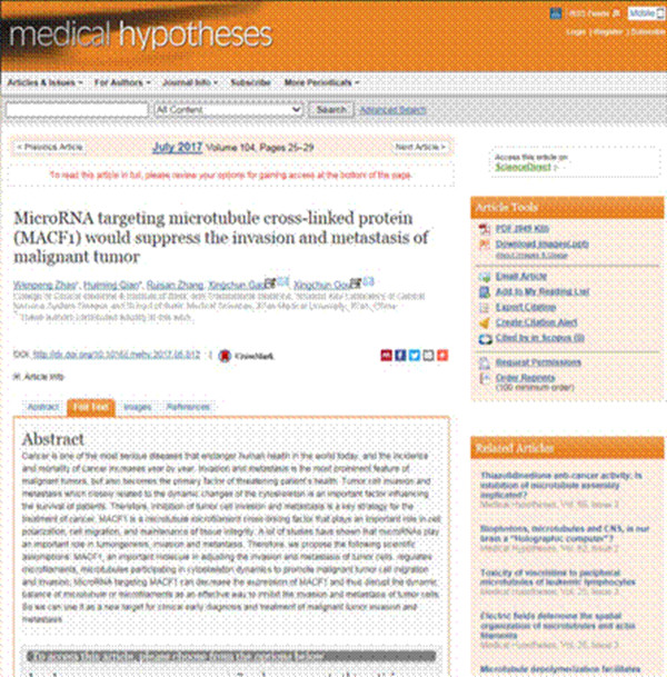 (临床医学院 团委)近日,我校临床医学专业临本1490班赵文鹏、临本1369班钱慧明同学的科研成果在SCI杂志《Medical Hypotheses》上在线发表,网络链接:http://www.medical-hypotheses.com/article/S0306-9877(17)30159-7/fulltext。论文题目是“MicroRNA targeting microtubule cross-linked protein (MACF1) would suppress the invasion and metastasis of malignant tumor”。论文的通讯作者为基础医学部苟兴春教授,该研究...