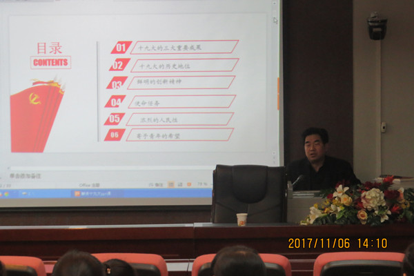 11月6日下午,纪委书记吴毅围绕十九大精神到护理学院学术报告厅为学生讲党课。并对班子成员进行廉政谈话。 讲课现场 吴毅书记在讲课中指出,十九大历史意义重大,是新时代的里程牌,大力推进了马克思主义中国化 ,吹响了新时代前进的号角,对国际社会产生重要影响。大会形成了三大重要成果,最重要的是提出了“习近平新时代中国特色社会主义思想”。十九大报告内容丰富,思想恢弘,体现出浓烈的人民性,总结起来具有新时代、新...