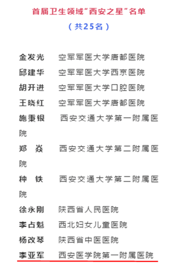 10月22日,西安市“弘扬爱国奋斗精神、建功立业新时代”活动安排部署会胜利召开,省委常委、市委书记王永康等领导出席会议,并发表重要讲话。 大会宣读了《在全市知识分子中深入开展“弘扬爱国奋斗精神、建功立业新时代”活动实施方案》,并表彰了来自科技、文化、卫生领域的75名首届“西安之星”。我校第一附属医院李亚军院长荣获卫生领域“西安之星”荣誉称号。 荣誉证书 首届“西安之星”评选工作由西安市委人才工作领导小...