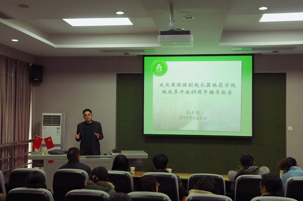 2019年1月8日下午,副院长黄保强到药学院学术报告厅作庆祝改革开放40周年专题辅导报告。药学院院长秦蓓及药学院全体教师和学生代表参加了本次报告会。会议由药学院党总支副书记吕忠田主持。 黄保强副院长作庆祝改革开放40周年专题辅导报告 报告中,黄保强副院长首先从国际视角对我国改革开放四十周年的评价出发,充分肯定了改革开放以来所取得的伟大成就,印证了改革开放使中国人民从站起来到富起来,从富起来到强起来的伟大飞...