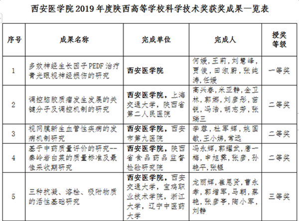 2月22日,陕西省教育厅公布了2019年度陕西高等学校科学技术奖励成果的评选结果,我校推荐的科技成果获批5项,其中一等奖1项、二等奖3项、三等奖1项,创历年获奖最好成绩。 这次以我校为第一完成单位的5项获奖科技成果分别为:第二附属医院何媛教授作为第一完成人的科技成果“多效神经生长因子PEDF治疗青光眼视神经损伤的研究”获一等奖;基础医学部高兴春副教授作为第一完成人的科技成果“调控脑胶质瘤发生发展的关键分子及调控...