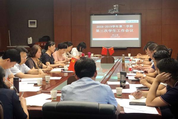 7月3日下午,本学期第三次学生工作会议在马克思主义学院会议室召开。校党委副书记熊冬梅出席会议并作讲话。校团委、各学院党总支书记(副书记)、第一临床医学院、第二临床医学院党委书记、学生科长、团总支书记、学工部全体人员参加了会议。会议由学工部部长、学生处处长靳红樱主持。 学生工作会议现场 首先,卫生管理学院党总支副书记刘建刚就少数民族学生教育管理的专项培训精神进行了传达和学习。接下来,学生处副处长昝倩...