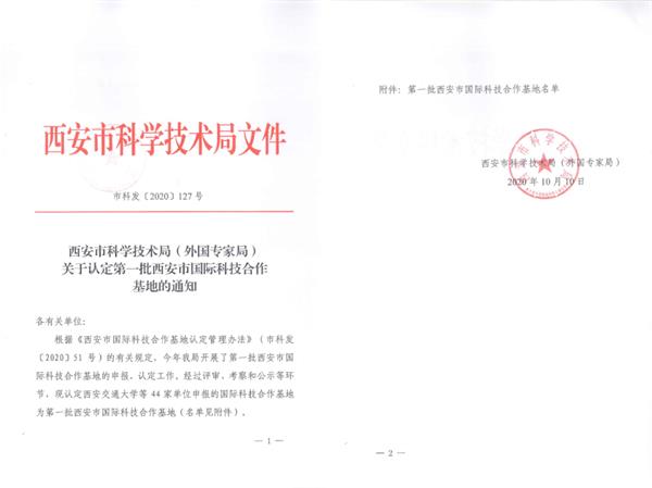 近日,西安市科学技术局(外国专家局)公布了《关于认定第一批西安市国际科技合作基地的通知》(市科发〔2020〕127号),我校被认定“第一批西安市国际科技合作基地”。本次获批的西安市国际科技合作基地由基础与转化医学研究所根据学科特色、研发实力、国际合作情况等,进一步凝炼、协调申报并获批。这也是学校第一个厅局级国际科技合作基地。 近年来,学校始终以提升科研水平和科技创新能力为抓手,抓重点、补短板、强特色,...