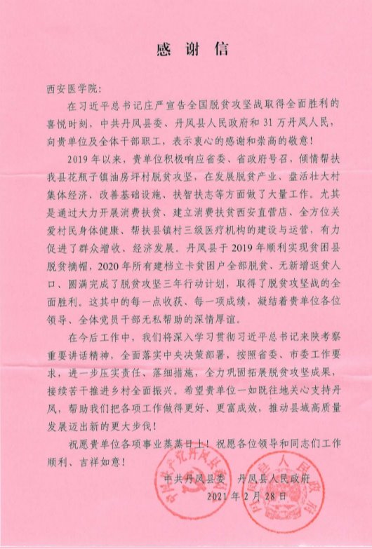 近日,我校收到中共丹凤县委、丹凤县人民政府感谢信,对我校的帮扶工作表示衷心的感谢和崇高的敬意。丹凤县于2019年顺利实现贫困县脱贫摘帽,2020年所有建档立卡贫困户全部脱贫、无新增返贫人员,圆满完成了脱贫攻坚三年行动计划,取得了脱贫攻坚战的全面胜利。我校自2019年6月4日帮扶丹凤县油坊坪村以来,学校10名校领导累计21人次,14个党总支、1个附属医院累计440人次,先后赴村开展各项帮扶活动46次,直接投入、捐赠、消费...