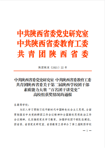 近日,由中共陕西省委党史研究室、中共陕西省委教育工委、共青团陕西省委举办的第二届陕西学校团干部素质能力大赛“百名团干讲团史”高校组比赛成绩揭晓。在本次比赛中,我校荣获“优秀组织奖”荣誉称号,校团委书记韩文霞荣获“高校团委书记组”三等奖,全科医学院团总支书记樊荣、医学技术学院团总支书记王心荣获“专职团干部组”优秀奖,药学院学生陈景怡荣获“学生团干部组”二等奖。本次大赛于3月启动,以“百名团干讲党史...