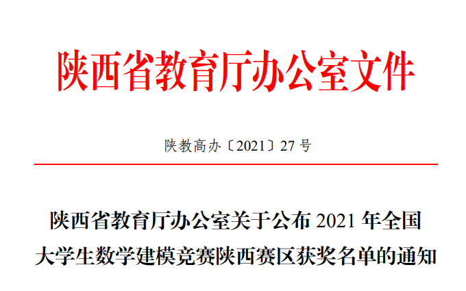 近日,陕西省教育厅印发了《陕西省教育厅关于公布2021年全国大学生数学建模竞赛陕西赛区获奖名单的通知》(陕教高办〔2021〕27号),我校获得陕西赛区二等奖1项。全国大学生数学建模竞赛是由教育部高教司和中国工业与应用数学学会主办,是目前全国高校规模最大的综合性学科竞赛之一。本次竞赛陕西共有82个高校3633支代表队参加,我校2个参赛队也是首次参加此项赛事,并取得了学校在这一赛事中成绩零的突破。在此,学校对获奖师生....