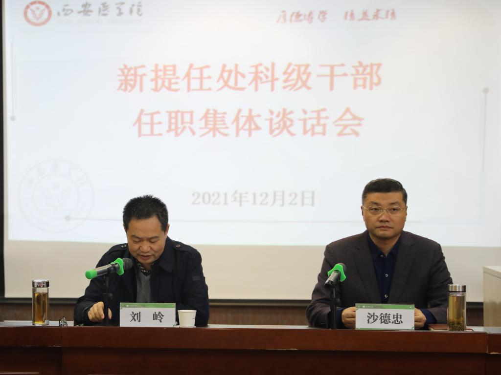 12月2日上午,我校新提任处科级干部任职集体谈话会在护理与康复学院一楼视频会议室召开。校党委书记刘岭和校党委副书记、纪委书记、监察专员沙德忠出席会议,新提任的37名处科级干部参加了集体谈话会。会议由刘岭书记主持。首先,刘岭书记对本次干部提任情况作了简要说明,并代表党委对新提任的处科级干部表示衷心地祝贺。他指出,这次干部选拔任用是我校一次性提拔干部较多的一次,其中,新提任10名正处级干部、2名副处级干部....