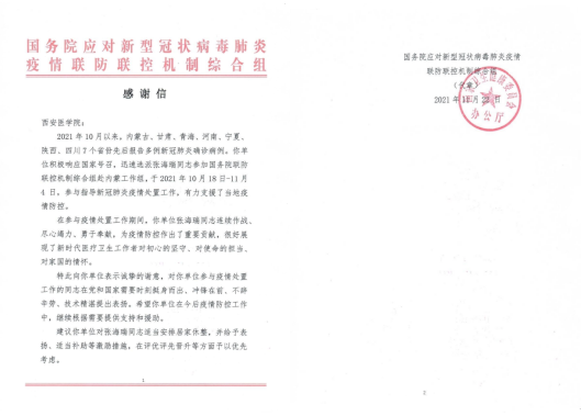 近日,国务院应对新型冠状病毒肺炎疫情联防联控机制综合组向我校发来感谢信,对我校在内蒙古额济纳旗抗疫工作中的迅速支援以及张海瑞同志的出色表现表示诚挚感谢。感谢信写道,“2021年10月以来,内蒙古、甘肃、青海、河南、宁夏、陕西、四川7个省份先后报告多例新冠肺炎确诊病例,你单位积极响应国家号召,迅速选派张海瑞同志参加国务院联防联控机制综合组赴内蒙工作组,于2021年10月18日-11月4日,参与指导新冠肺炎疫情处置工...