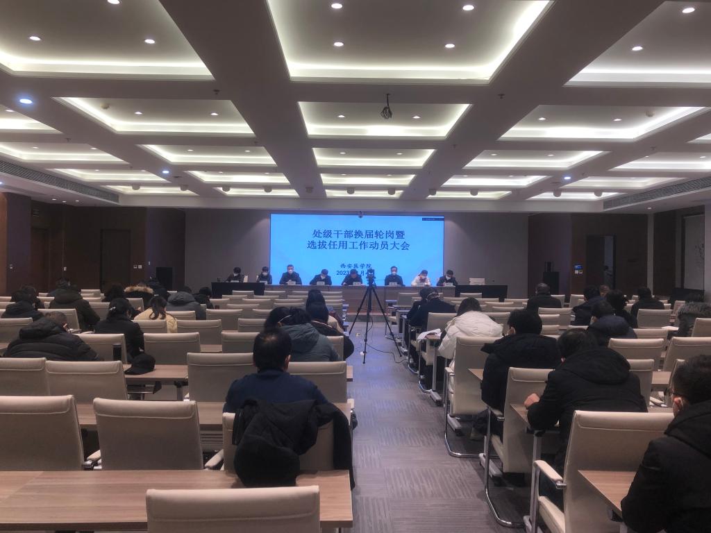1月4日,学校以线上线下相结合的方式召开处级干部换届轮岗暨选拔任用工作动员大会。党委书记刘岭作动员讲话,党委副书记、纪委书记沙德忠部署换届纪律要求,会议由校长杨帆主持。全体校领导、校本部全体处、科级干部,直属附属医院处级干部参加会议。会议强调,加强学校干部队伍建设是深入贯彻习近平总书记关于教育重要论述和党的二十大精神的现实要求。学校处级干部换届轮岗暨选拔任用工作,事关学校治理体系和治理能力现代化....