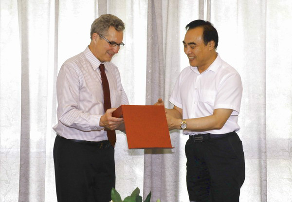 (国际办)7月4日下午,院长杨帆在行政楼会议室会见了美国哈町大学教育学院院长雷蒙德·威尔登一行三人,双方就开展联合培养项目展开交流探讨。李雪萍副院长、国际交流与合作办公室主任郭婷、英语系主任陈蓁等参加了会议。会议由李雪萍副院长主持。 杨帆院长向哈町大学赠送纪念品 会上,李雪萍副院长致欢迎辞并简要介绍了我校建校历史和目前基本办学情况。随后,杨院长表示,leyu·乐鱼(中国)体育官方网站重视办学质量,遵循开放办学政策。与国外的...