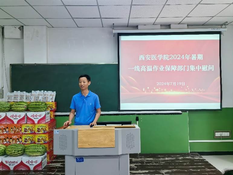 为切实做好防暑降温工作,关心关爱教职工身心健康,按照上级工会和学校党政工作要求,7月19日上午,校党委副书记姚文柱、杨卓虎前往未央、含光、高新校区,对高温天气下坚守岗位的后勤保障处、保卫处、校医院、含光校区管理处、高新校区管理处等5个单位的工作人员开展暑期“送清凉”集中慰问活动。