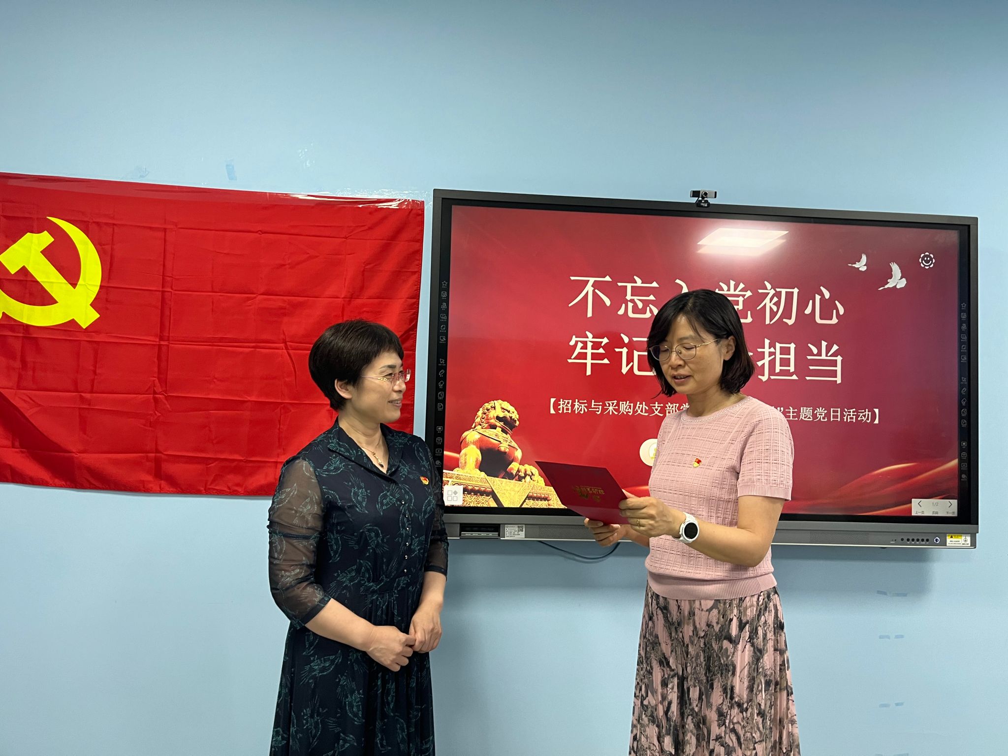为加强党性教育,强化党员身份意识和责任意识,激发党员政治热情,7月1日下午,招标与采购处支部为党员集体过“政治生日”。主题党日活动通过赠送“政治生日”贺卡、“政治生日”礼物,重温入党誓词、党员追忆入党初心、发表政治生日感言等颇具仪式感的环节,激励党员永葆初心。副校长和新盈以普通党员身份参加活动。