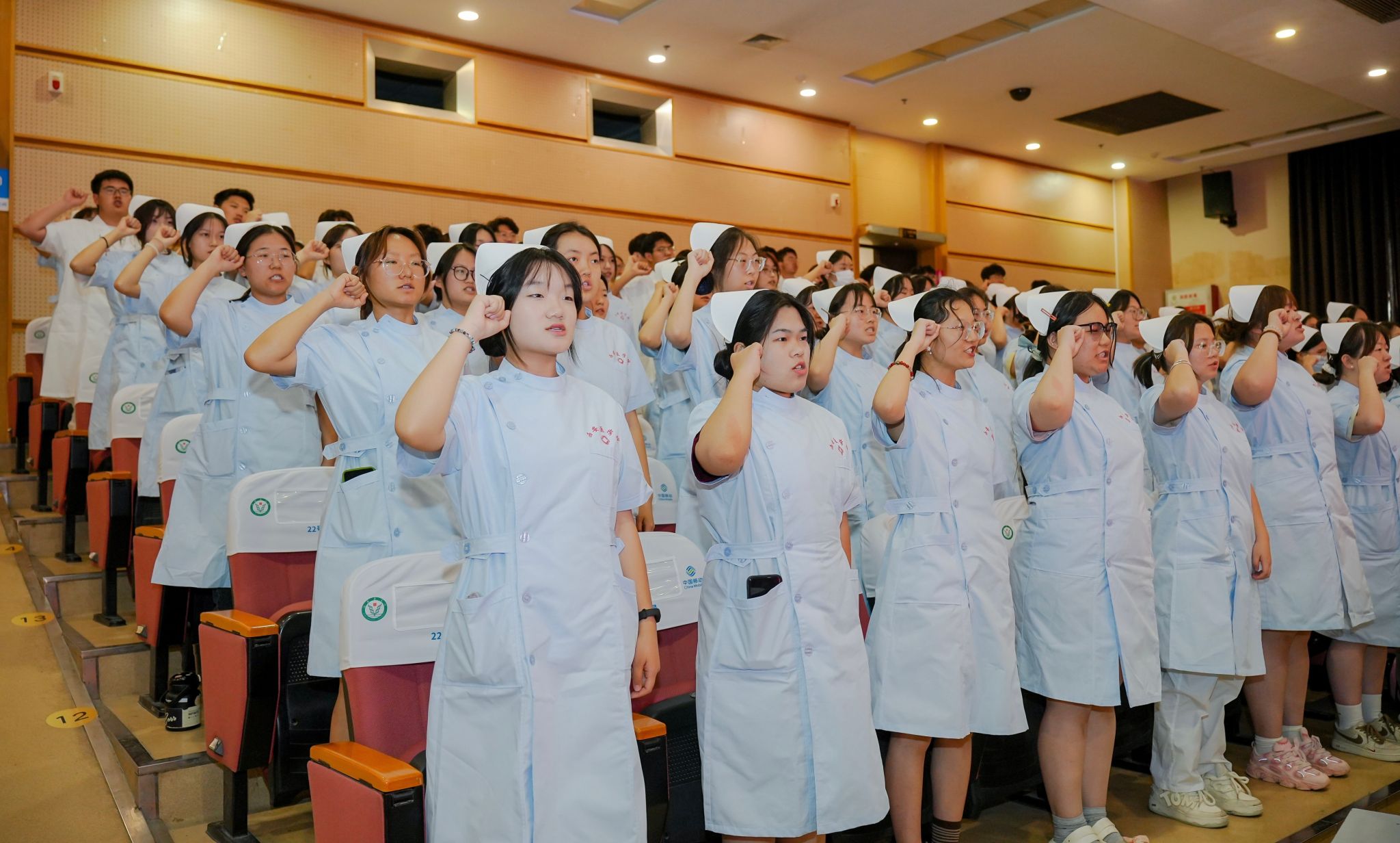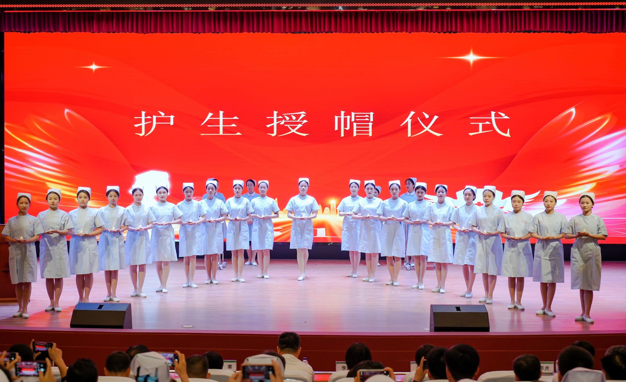授帽仪式上,护理专家前辈为护生佩戴燕帽,接过前辈手中的蜡烛,在熠熠烛光中,护生们佩戴着洁白的燕帽进行了庄严宣誓。