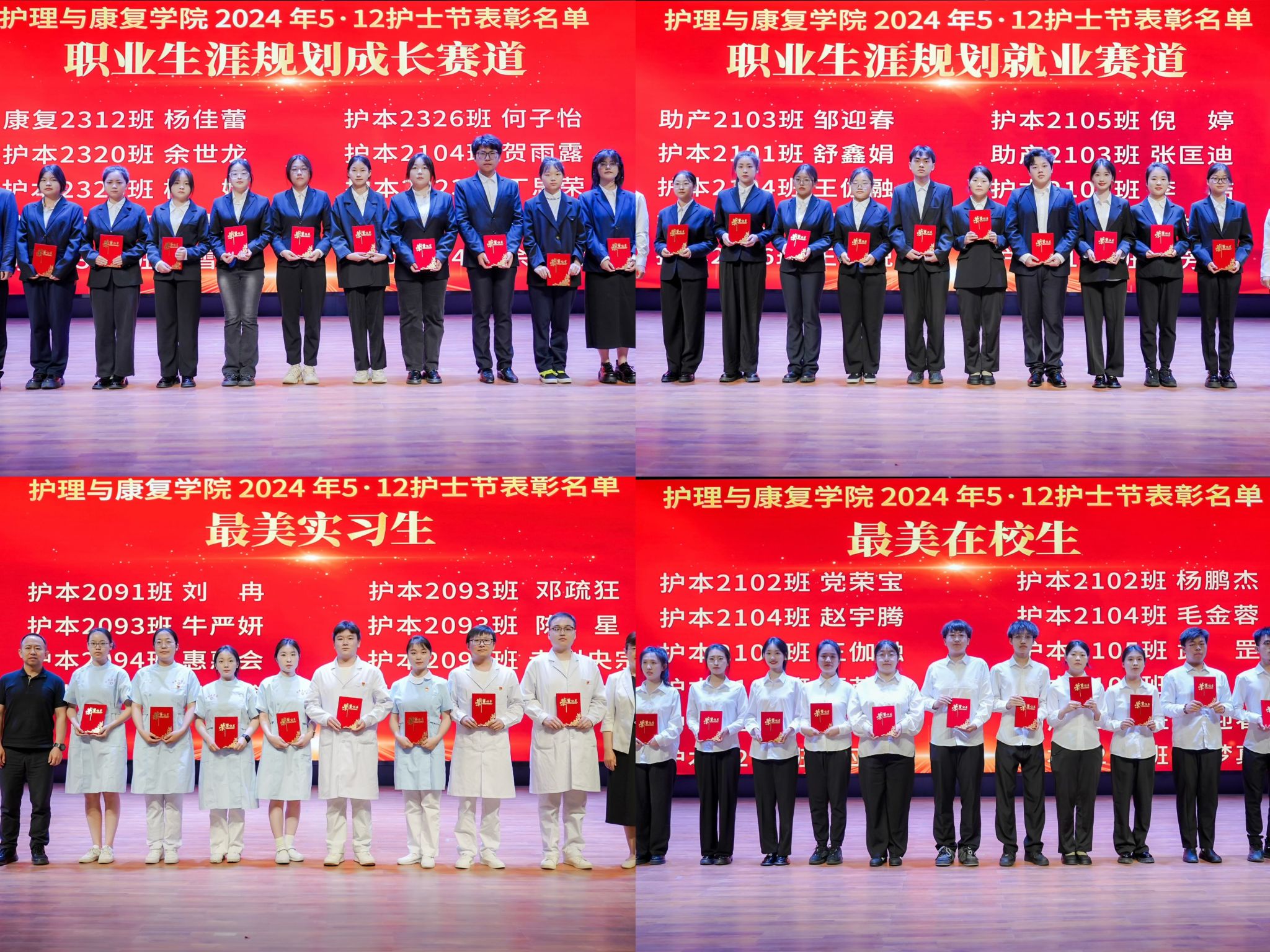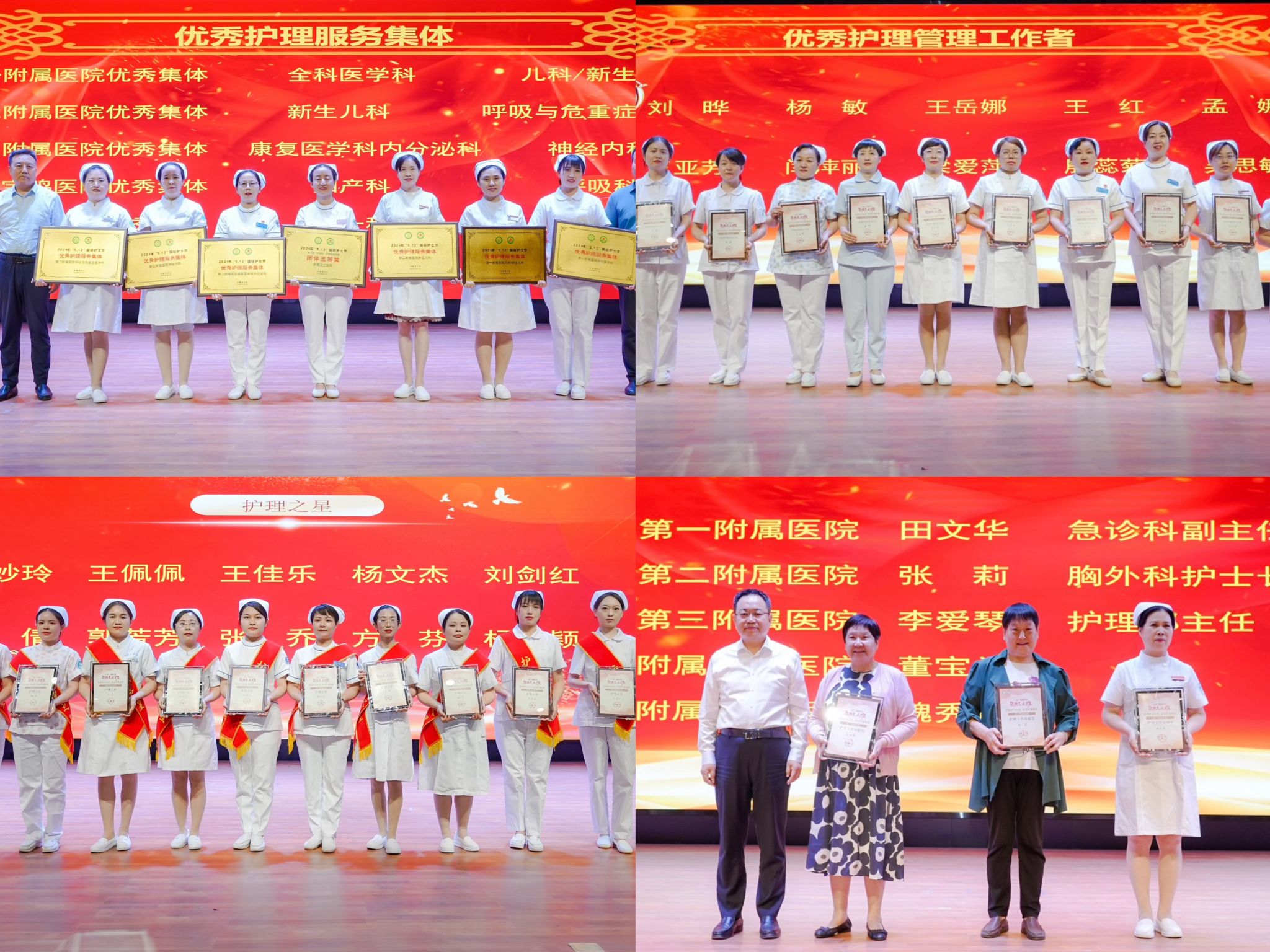 党委副书记熊冬梅宣读护理与康复学院表彰文件,党委副书记杨卓虎宣读leyu·乐鱼(中国)体育官方网站附属医院表彰文件,与会领导为获得表彰的集体及个人颁发奖牌及证书。