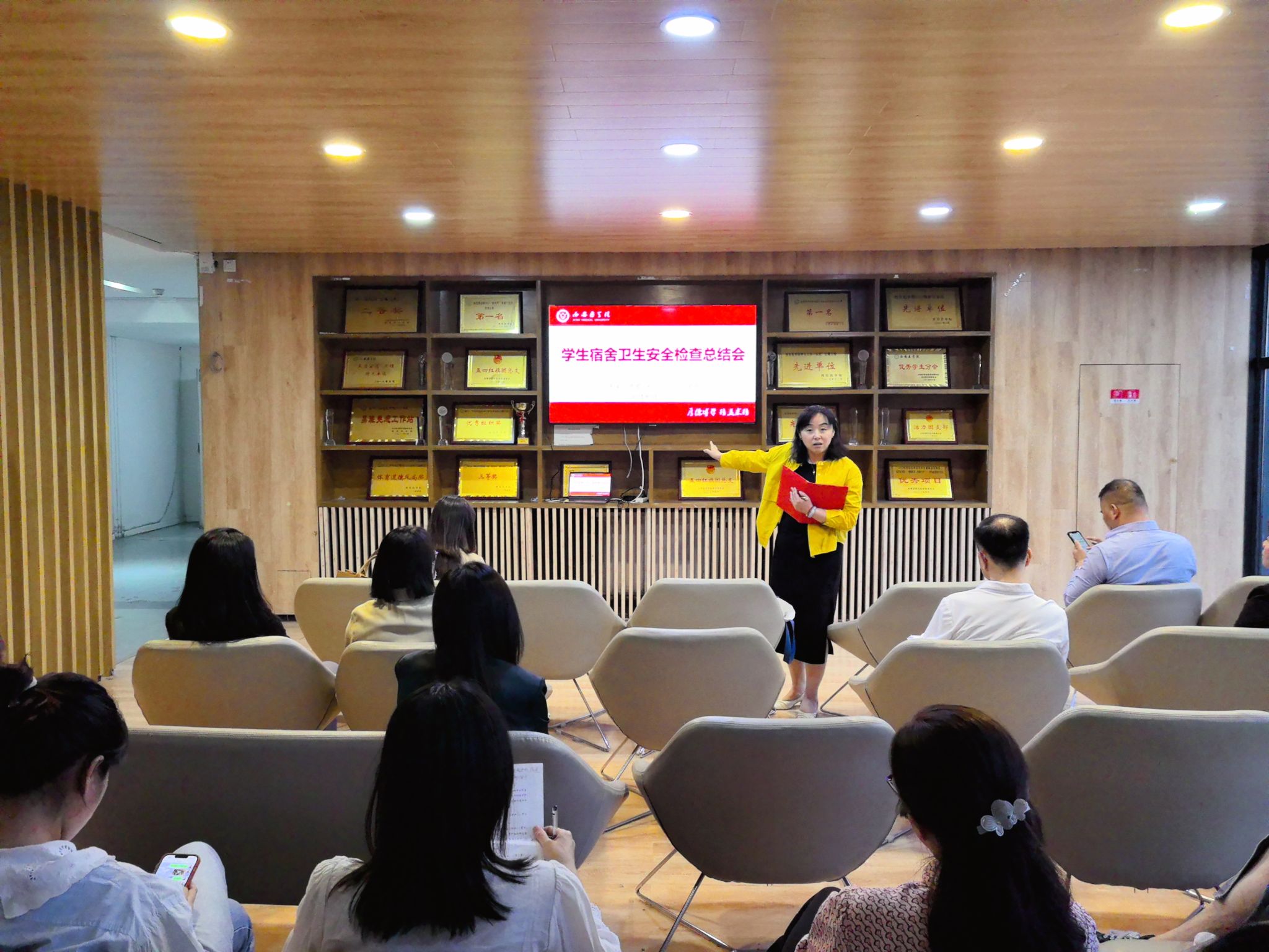 会后,各学院分成十一个小组,重点从宿舍环境卫生、用水用电安全隐患、学生社区意识形态三个方面按楼栋交叉检查,历时5个小时,共计完成698间宿舍安全检查工作。各小组就宿舍现存安全问题进行总结反馈,并对整改措施进行汇报交流。随后,昝倩针对此次全面拉网式安全排查工作进行总结,她对学工干部及辅导员的积极参与和支持给予肯定,要求各学院以此次安全检查为契机,结合专业特点和学生诉求,细化工作管理措施,完善社区制度建设,进一步加强学生社区安全稳定督导检查工作;依托“一站式”学生社区分站,发挥平台育人功能作用,及时总结凝练工作做法,逐步形成“一楼一品”管理特色,打造学院育人品牌,全方位提升育人工作实效。