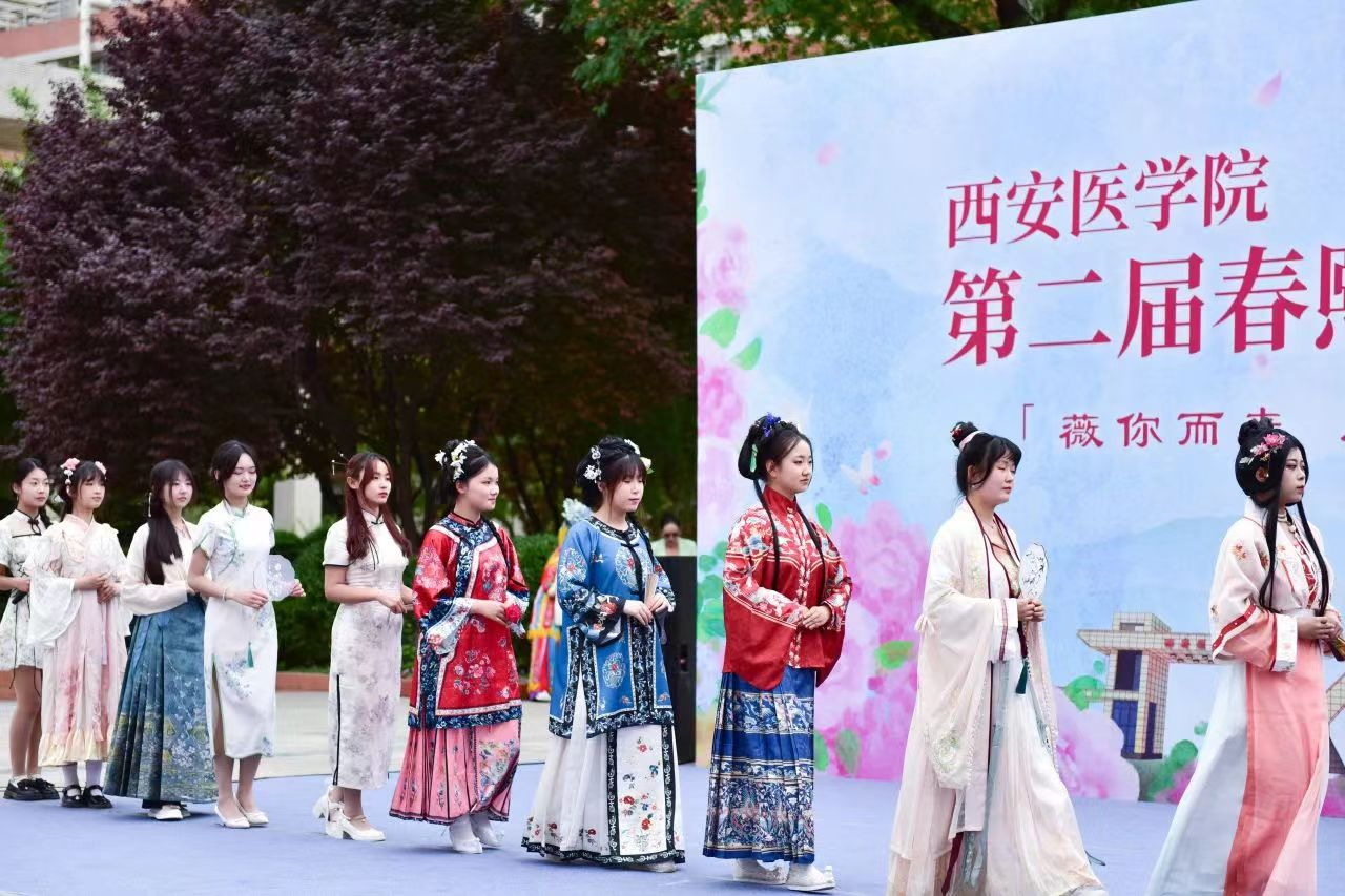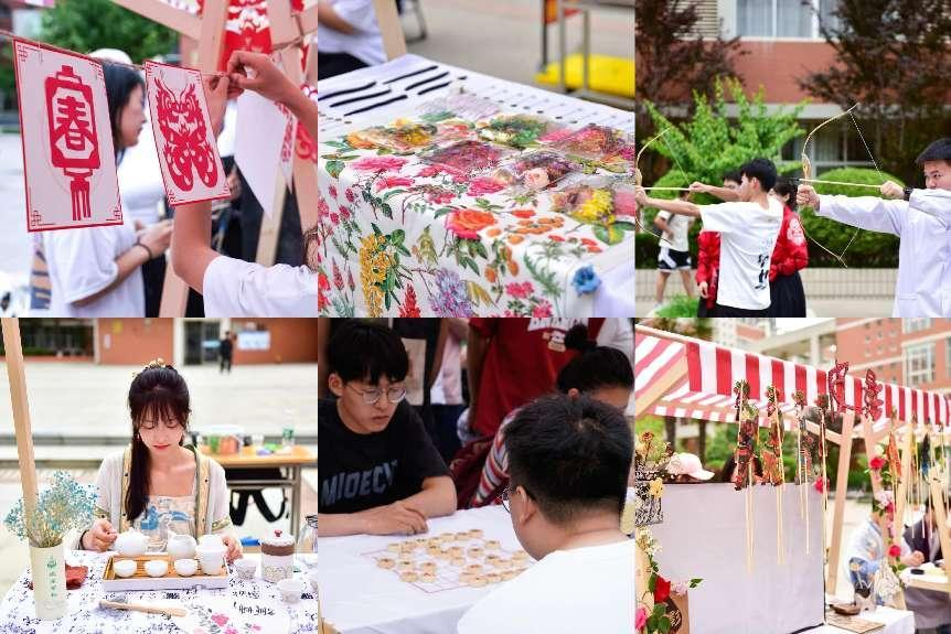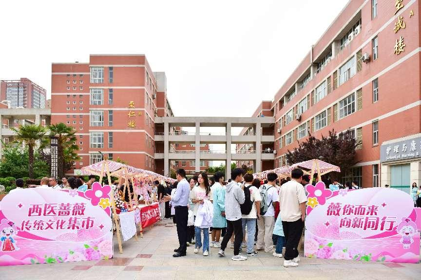 开幕式结束后,师生相聚琳琅满目的传统文化集市。各学院、学生社团结合各自专业和特色精心筹划、异彩纷呈。临床医学院妙手慧心绘春日美好,将浪漫留在团扇上;药学院一捧春水煎中药花茶,以茶载道,以茶会友,慢品人间春色;护理与康复学院于妙笔丹青中绽放诗韵;卫生管理学院“一纸一影,戏吟古今”,展示剪纸及皮影戏的魅力;公共卫生学院“一甲一锁探千年”竞猜甲骨文、解密鲁班锁;后勤保障处研习传统陕西花馍制法,显露非遗技艺;扁鹊养生协会“寻药觅味”现场为师生按摩艾灸;衡芷书画摄影协会于翰墨神韵中寻书法逸兴......猜灯谜、学簪花、穿汉服、品美食,师生畅享游集市之乐,体味中华传统文化雅韵,感受盛世蓬勃气象。
