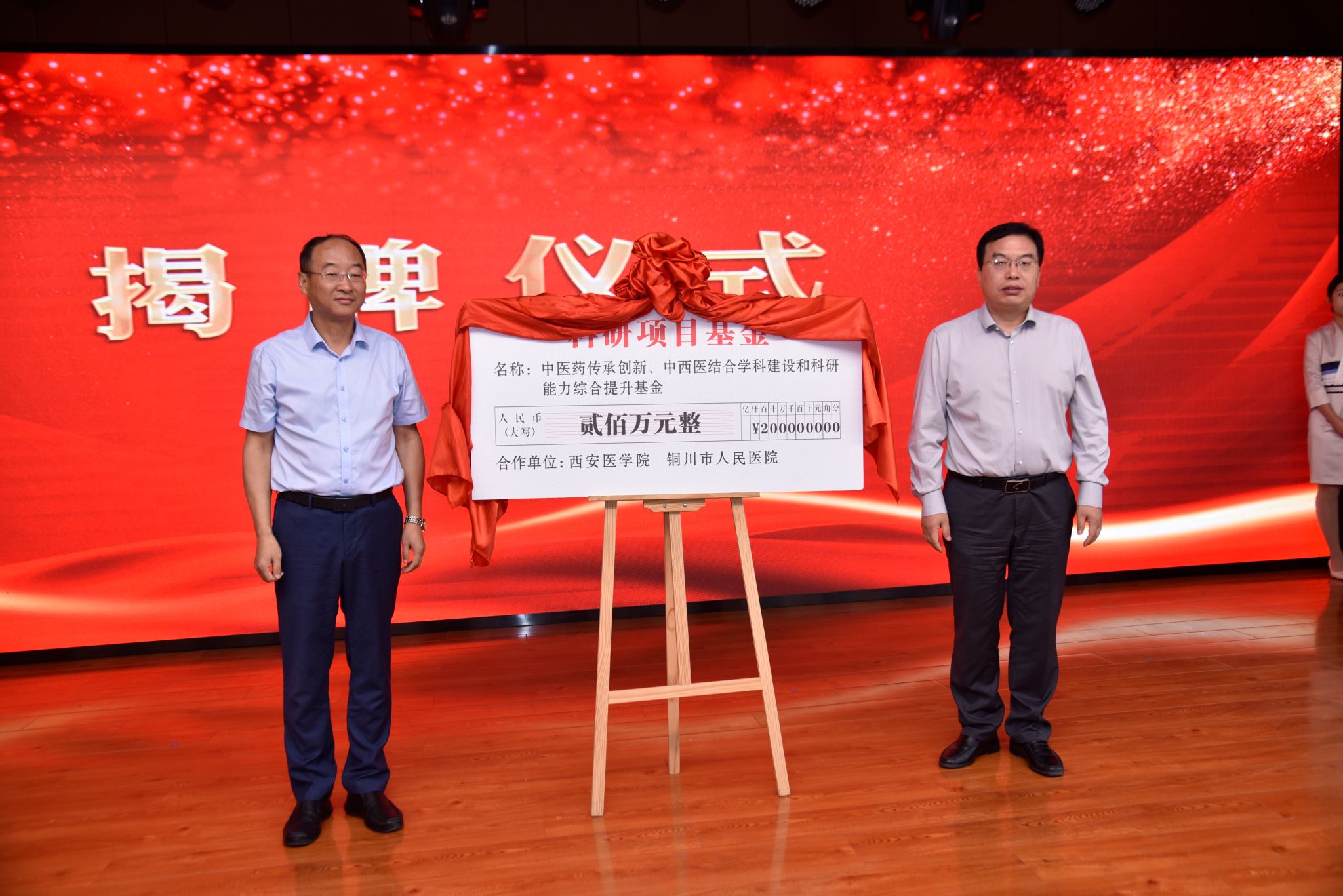 巩守平与支小卫共同为中医药传承创新、中西医结合学科建设和科研能力综合提升基金标牌揭牌。