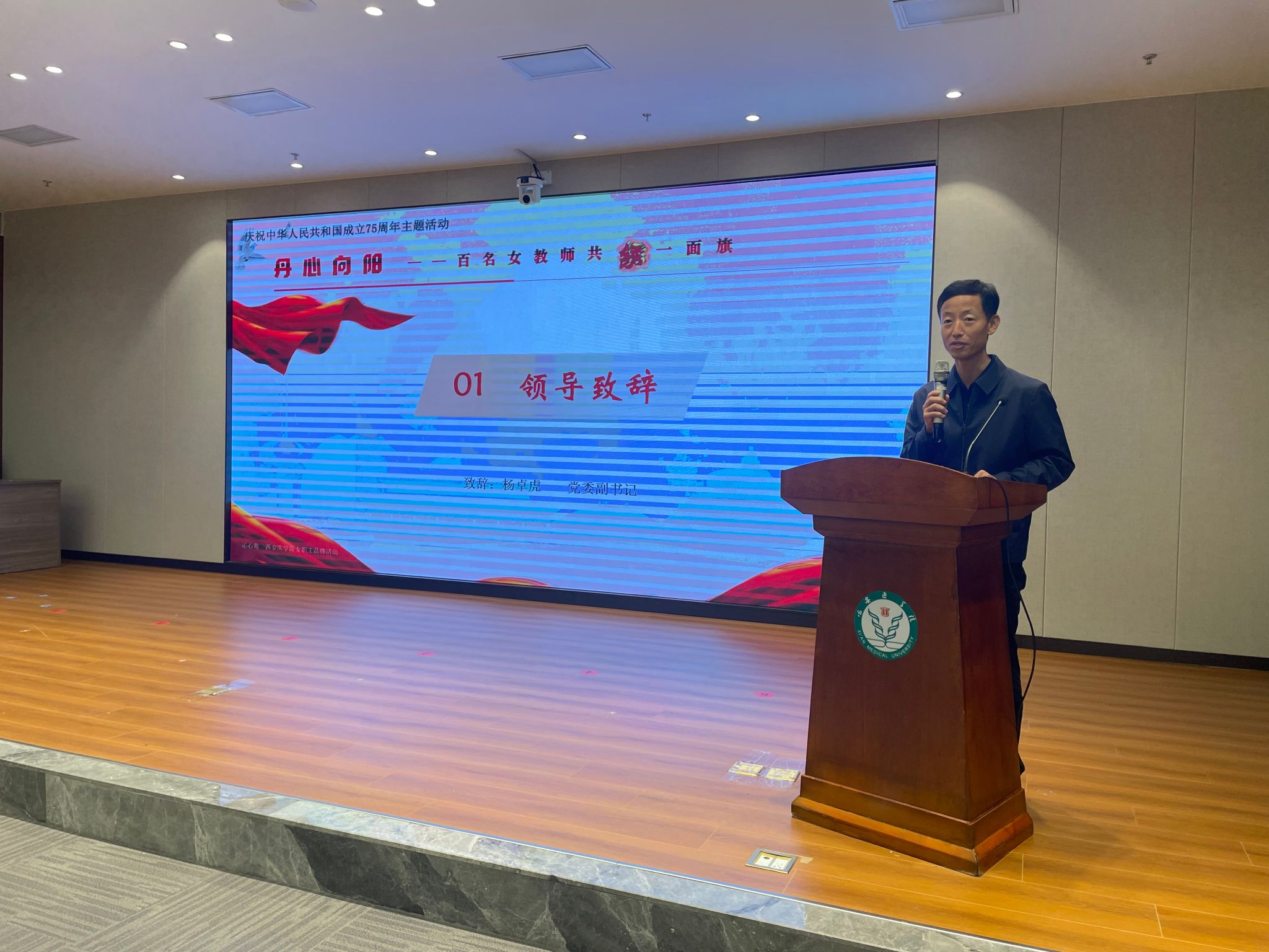 9月30日,为庆祝中华人民共和国成立75周年,由校工会主办、女工委承办的“丹心向阳——百名女教师共绣一面旗”主题活动在未央校区开展。党委副书记杨卓虎,副校长李雪萍、和新盈出席活动。女工委员、基础医学部党总支书记尚瑜主持。