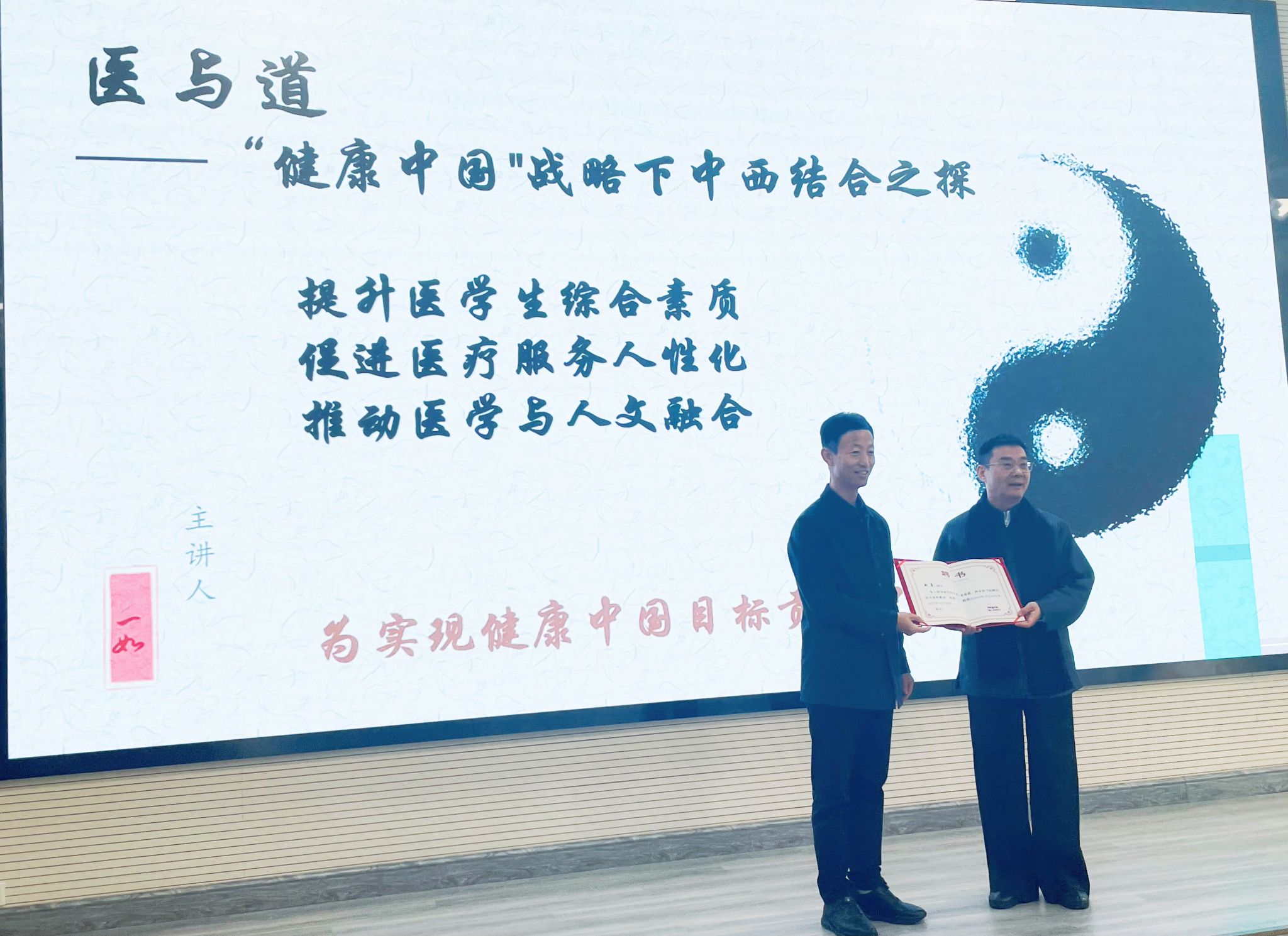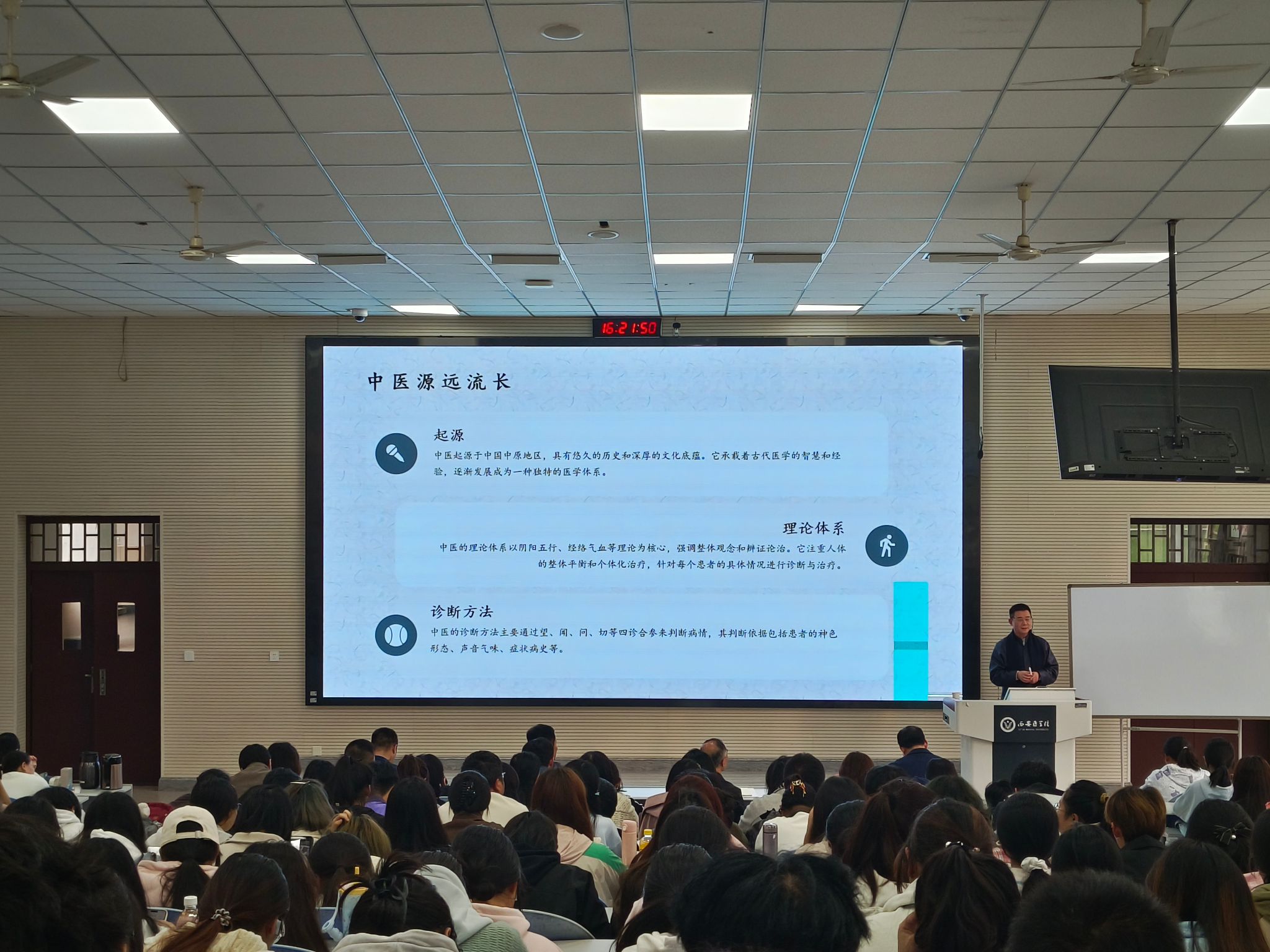 赵勇以“医与道——健康中国战略下中西结合之探”为主题,为与会师生带来了一场精彩的学术报告。他从中医药文化的历史渊源讲起,分析了古代的中医和现代的中医、东方的中医和西方的西医、南方治疗风寒感冒的荆芥和北方治疗风寒感冒的麻黄,他娓娓道来、深入浅出,引申出了先天之“炁”和后天之“氣”,提出中医中道之“道气论”、气化一分为二之“阴阳学说”、阴阳化生五行之“太极图与五行”等哲学思想、诊疗方法与独特优势,让在场师生深刻感受到了中医药文化的博大精深,并结合当前健康中国建设需求,强调了中医药在慢性病防治、养生保健、康复医疗等方面的独特价值,以及其在应对全球性健康挑战中的潜力。互动环节中,现场师生就中医药文化传承、产学研合作路径等问题同赵勇进行了热烈互动。就学生提出的如何解决病理性脱发问题,他分别从中医的心主血脉,肝藏血、主疏泄,脾生血、主运化,肺主皮毛等角度予以调理,强调可以预防和治疗。现场气氛活跃,学术氛围浓厚。
