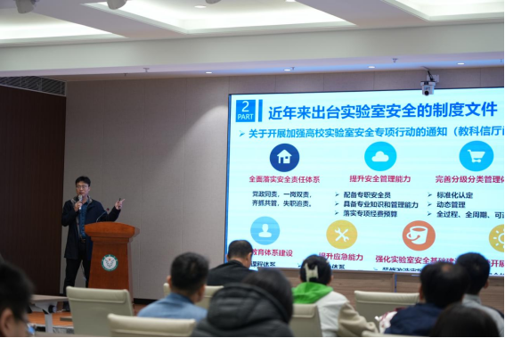 随后,实验室安全专题讲座在图书馆五楼会议室进行,讲座邀请西安交通大学实验室管理处副处长徐四龙主讲,主题为“居安思危、思则有备、备则无患——高校实验室安全管理实践与探索”。教师们纷纷表示,通过此次讲座,对实验室安全重要性有了更深刻的认识,在今后的学习和工作中一定更加严格遵守实验室安全管理相关制度要求,确保自身和他人的安全。