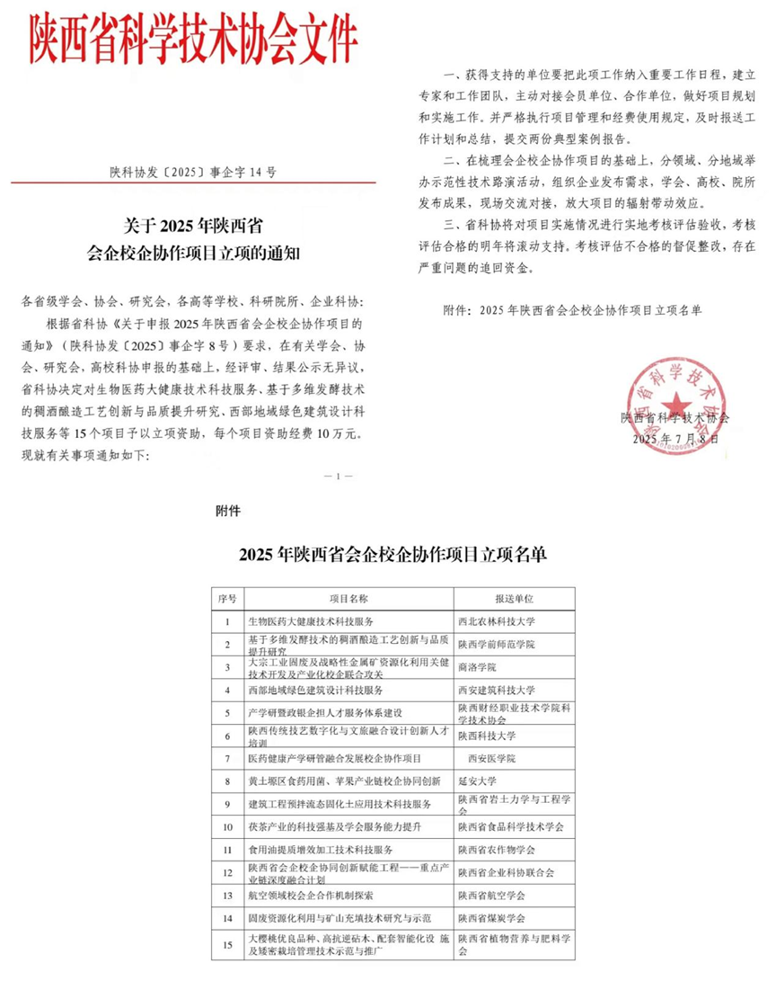陕西省会企校企协作项目是陕西省“百会百校助千企行动”的重要组成部分,由陕西省科学技术协会联合省教育厅、省工信厅、省工商联共同组织实施。项目旨在推动学会、高校、院所资源下沉,助力科技型中小企业和民营企业创新驱动发展,服务陕西省产业链升级、科技成果转化及区域经济高质量发展。本次全省共立项资助15个项目。