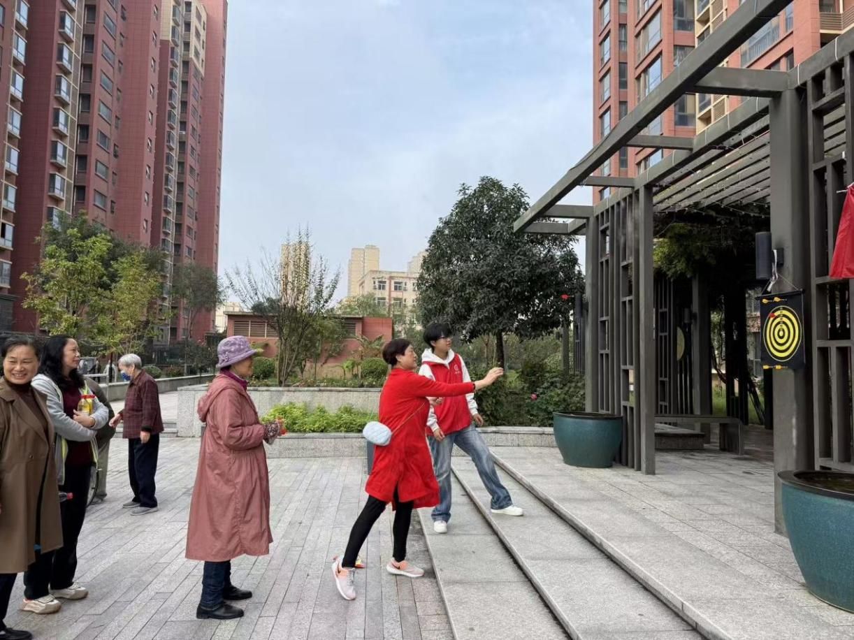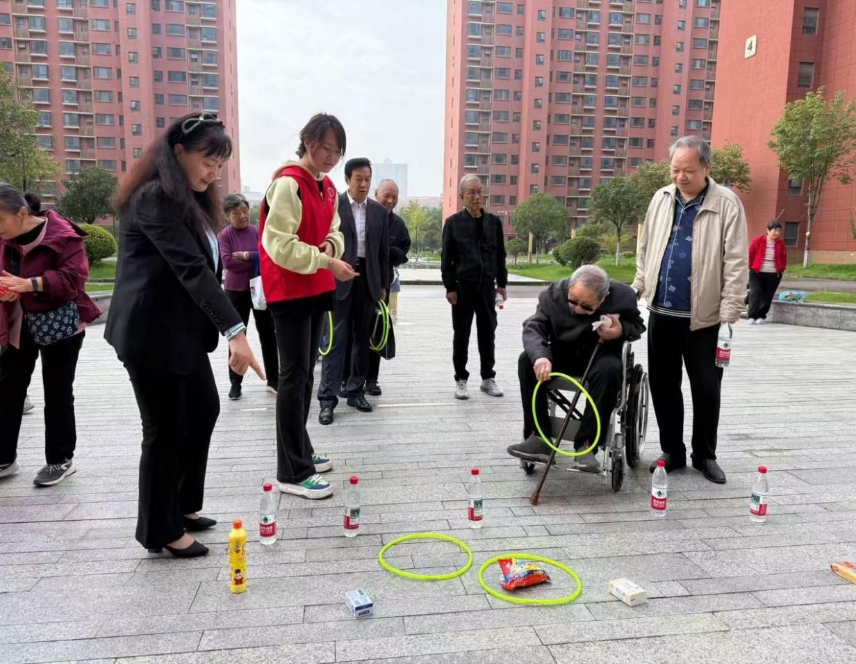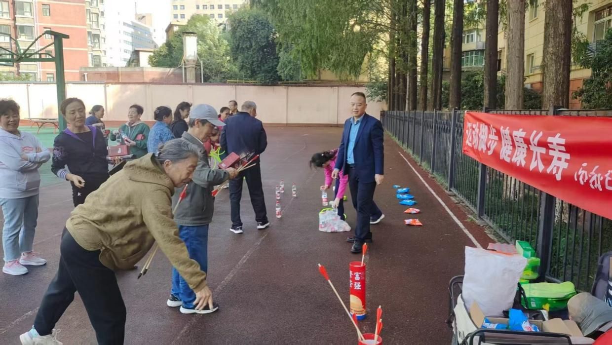 健步走结束后,套圈、投壶、掷飞镖等趣味运动会项目相继开展。“套圈夺宝”区前,97岁的边老师坐着轮椅眯着眼睛,手捏彩色套圈轻轻一抛,“中啦!中啦!” 随着圆环稳稳套住洗衣粉,周围立刻响起一片欢呼,边老师像个孩子似的举起奖品,笑得眼睛眯成了缝。有些老同志没投中,笑着捡起来继续,“输赢不重要,开心才是真的!”一句朴实的话,道出了现场所有人的心声。工作人员穿梭在各个项目间,脚步不停却始终面带微笑,细微之处尽显关怀。