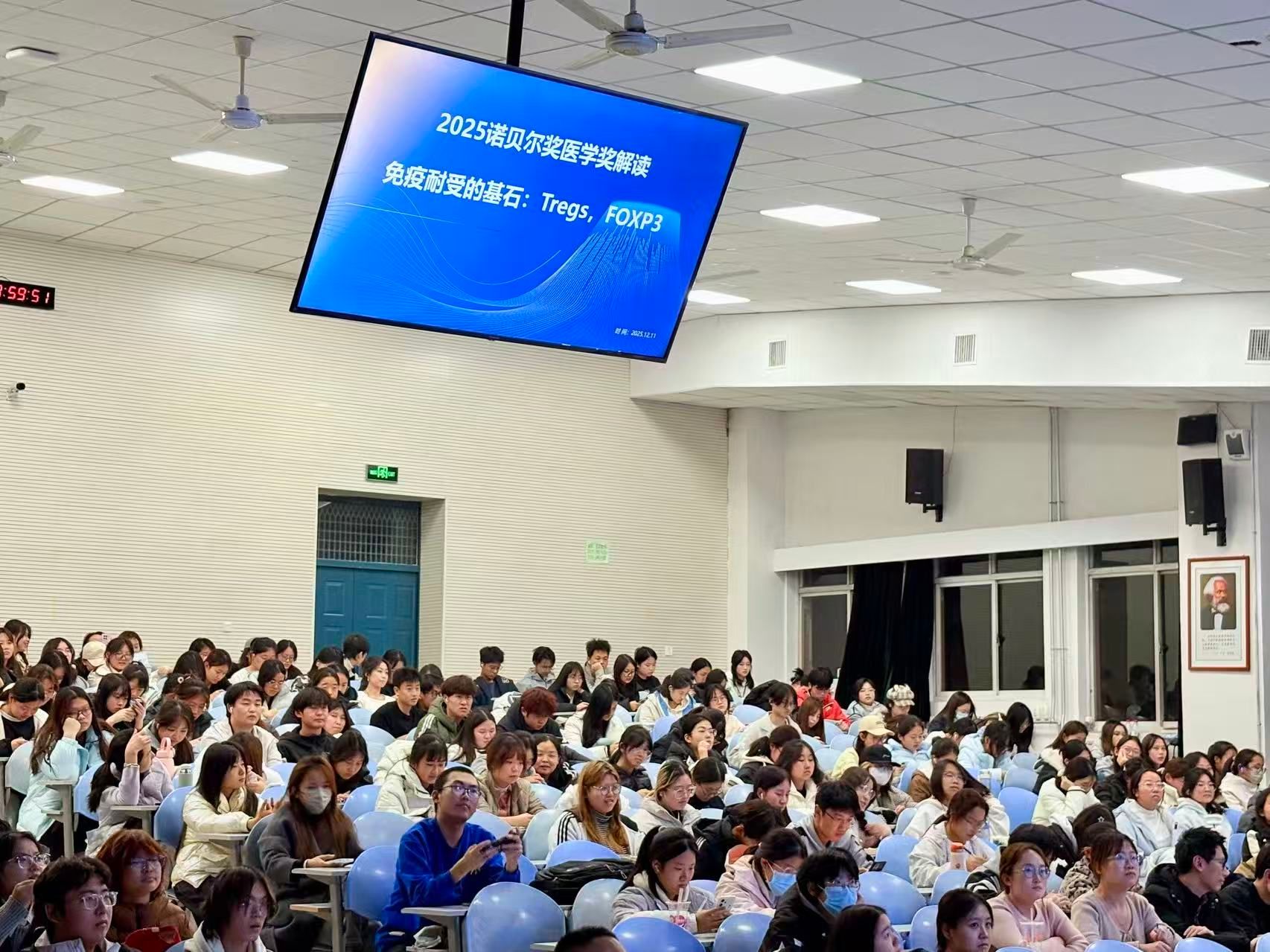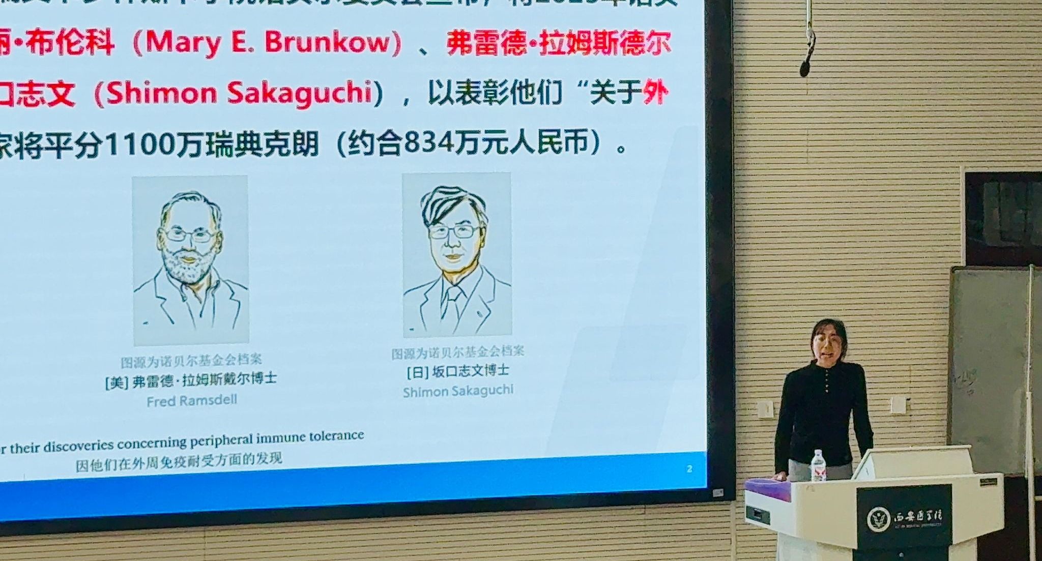 活动中,苟兴春聚焦2025年诺贝尔物理学奖,以深入浅出的讲解向大家阐释了量子物理与生命科学的跨界桥梁。他详细解读了量子隧穿并非仅存在于微观世界,而是深度渗透于生命活动的底层逻辑——从DNA碱基对中氢原子的隧穿引发基因突变,到蛋白酶催化反应中质子的隧穿调控代谢速率,量子隧穿效应在遗传信息传递、生物化学反应调控等核心生命过程中扮演着关键角色。同时,他介绍了该诺奖成果如何为疾病研究提供全新视角,为致病机理研究和靶向药物设计开辟了跨学科路径。栾晶围绕诺贝尔生理学或医学奖核心内容展开解读,聚焦免疫学领域的突破性进展。清晰阐释了相关成果在免疫耐受机制、疾病免疫干预等方面的科学价值与应用前景,为师生呈现了生命科学领域的前沿发展态势。