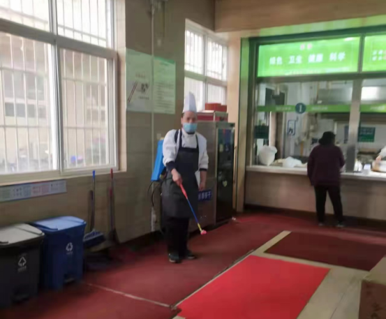 保洁部在完成每日的日常环境清洁及消杀工作的基础上,另增加每日四次对全院露天公共区域、电梯、楼道、家属区的全面消杀工作,并使用消毒液弥散机在每日晨6:00—6:30对住院部一楼、门诊内、外等公共区域进行喷雾消毒。动力中心每周对住院楼地下室公共区域及住院楼、行政楼、教学楼的中央空调及空调新风机组末端出风口进行消毒。
