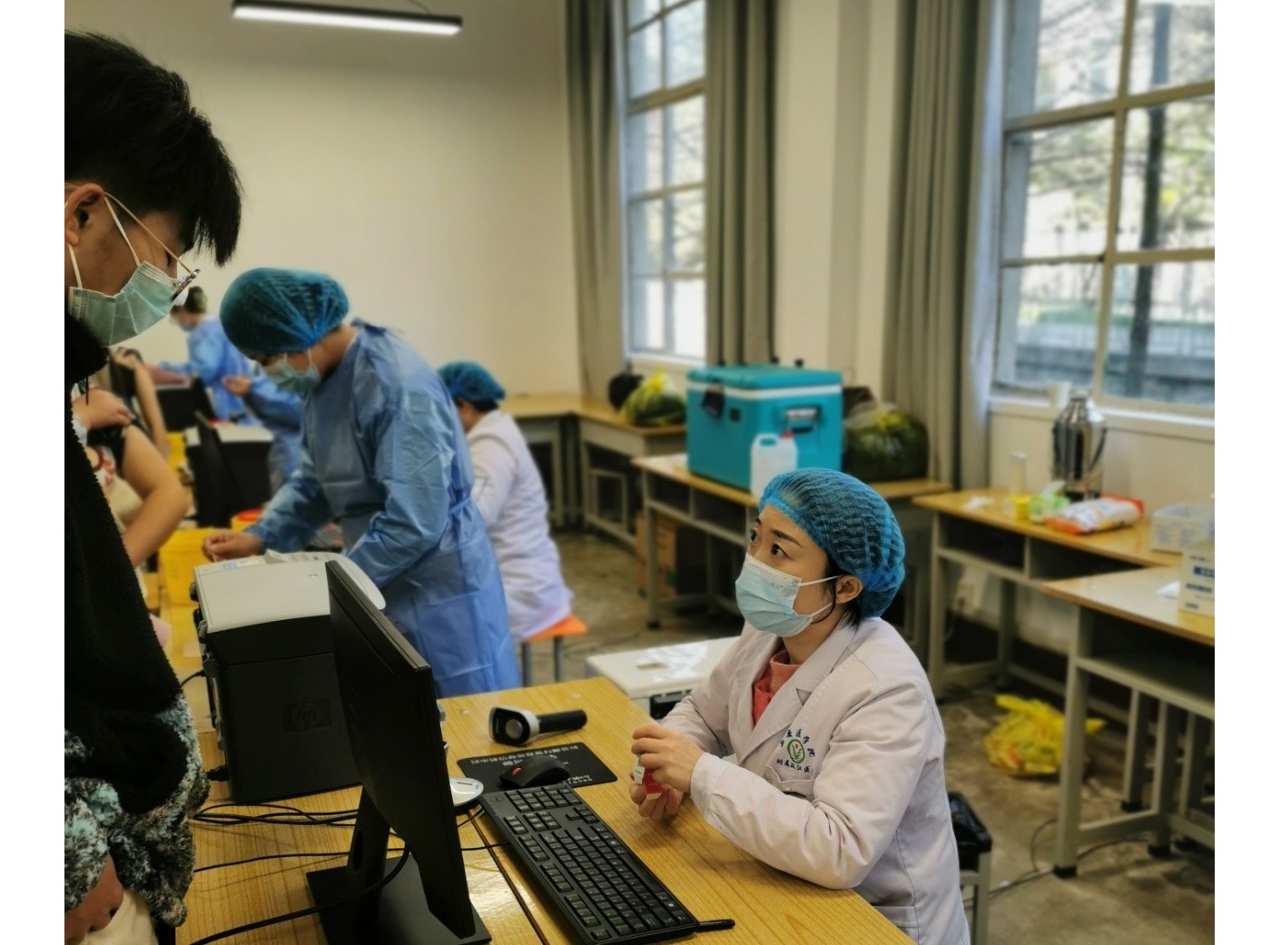 12月20日,为尽快构建疫情防控屏障,附属汉江医院主动派出医务人员到陕西省理工大学南区承担第三针疫苗接种任务。