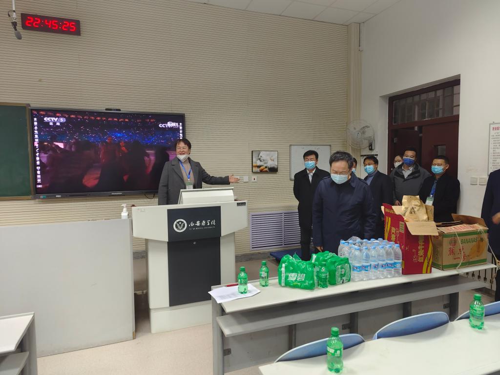 (党宣快讯)19日晚10:00,党委书记刘岭、副书记姚文柱带队慰问值班值守干部和辅导员,督导巡查校园疫情防控工作,先后到图书馆、教学楼、生活区食堂、学生公寓楼等重点区域检查门禁管理和防疫措施落实情况。强调要进一步夯实责任,以高度负责的态度落实落细各项防控举措,织密织牢疫情防控网,确保师生生命安全和身体健康。20日晚,刘岭、姚文柱深入教学楼、学生公寓看望学生并与球迷同学共享卡塔尔世界杯足球赛开幕式和首场球赛盛宴。校学工部暖心为学生观众准备了苹果及饮用水,各学院学工干部、辅导员陪伴收看并组织暖场节目,营造了有序欢乐的观看氛围。随后,校领导一行深入学生公寓巡查稳定安全工作,重点到2号、6号男生公寓楼看望值班值守学工干部和辅导员,叮嘱大家强化世界杯球赛期间的疫情防控意识,做好敏感时期学生思想教育管理工作。
