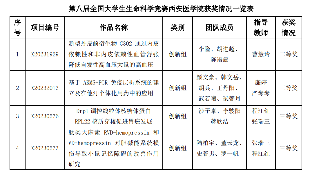 我校基础与转化医学研究所曹慧玲教授指导的本科生团队依托国家级大创项目以第一作者发表SCI论文“新型丹皮酚衍生物C302通过内皮依赖性和非内皮依赖性血管舒张降低自发性高血压大鼠的高血压”荣获全国二等奖。此外,我校临床医学院廉婷副教授、基础医学部程江红副教授和张瑞三副教授团队分别指导本科生项目获全国三等奖。