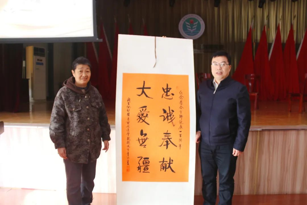 研讨会上,吴合同志的女儿朱建平女士受邀来到现场。深情讲述了母亲一丝不苟、不苟言笑,严谨求学、终生学习,要求严苛、诲人不倦的生平感人事迹。巩守平将自己亲手撰写的书法作品——“忠诚 奉献 大爱无疆”赠予朱建平。
