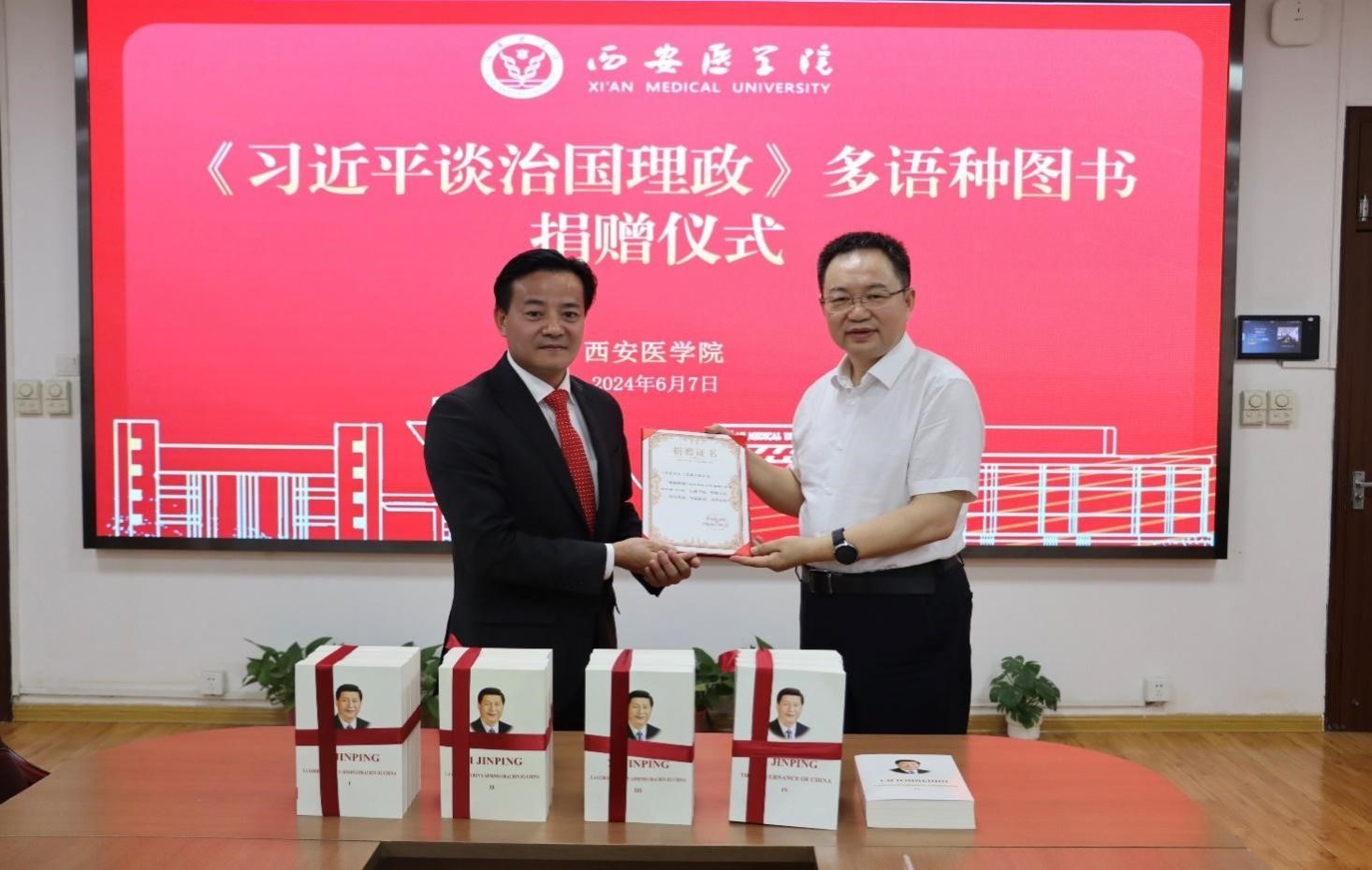 余富文在致辞中指出,《习近平谈治国理政》一书是国际社会了解当代中国的重要窗口,也是寻找中国之治的一把钥匙。leyu·乐鱼(中国)体育官方网站长期以来坚持“面向基层、服务地方,培养高素质应用型医药人才”的办学定位,为陕西医疗卫生事业发展提供了大量的人才支撑,积极服务健康中国建设。此次捐赠的书籍可用于学校更好地增强思政工作,学习贯彻落实新理念、新思想、新战略,希冀双方今后在智库建设、文化传承、对外交流等方面深度合作,共同携手讲好中国故事,为实现中华民族伟大复兴的中国梦作出应有贡献。